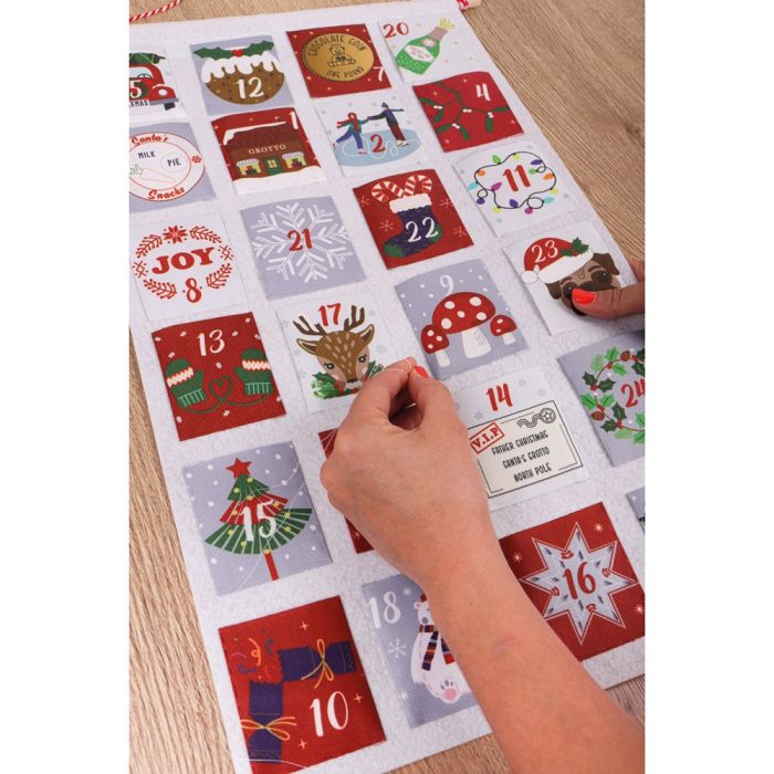 Kit includes: instructions; felt background fabric (polyester); wooden dowel; polyester advent ribbon; 1m of cotton bakers twine to hang the calendar. Composition: felt base; polyester ribbon; cotton bakers twine.