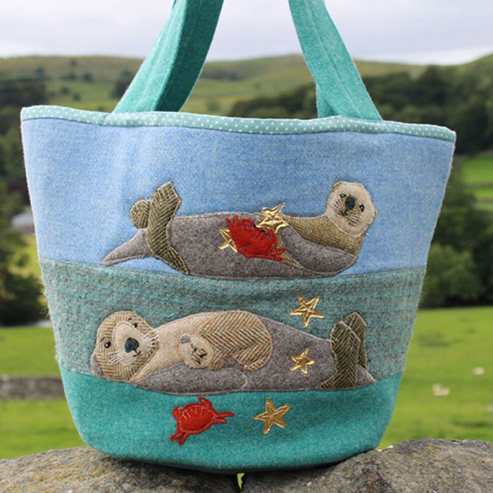Bobbing Along, this is the sewing pattern for our adorable sea otter patchwork beach bag . The sea otters are constructed very easily either using our Bosal In-R-Form method of appliqué or the usual fusible web method of appliqué. We have used a very simple strip patchwork method to piece the bag if you prefer you could make the sides all one fabric or swap them for more complicated patchwork piecing, can you imagine how impressive clam shells would look as an alternative?