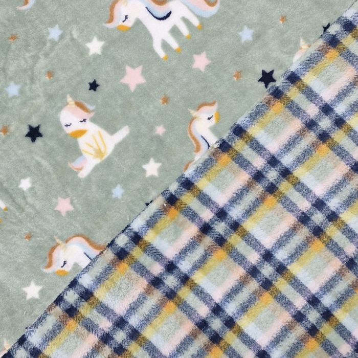 Double Sided Supersoft Fleece | Unicorn & Check Dusty Green