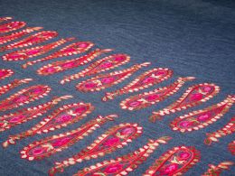 Cotton Denim base fabric embellished with a splendid Paisley Pendulum embroidery design to create a stunning border. Making fabulous use of colour, the embroidery is rich in detail.