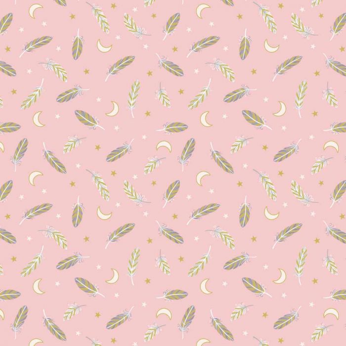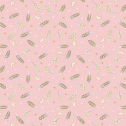 Enchanted Fabric | Feathers & Stars Pink - Gold Metallic