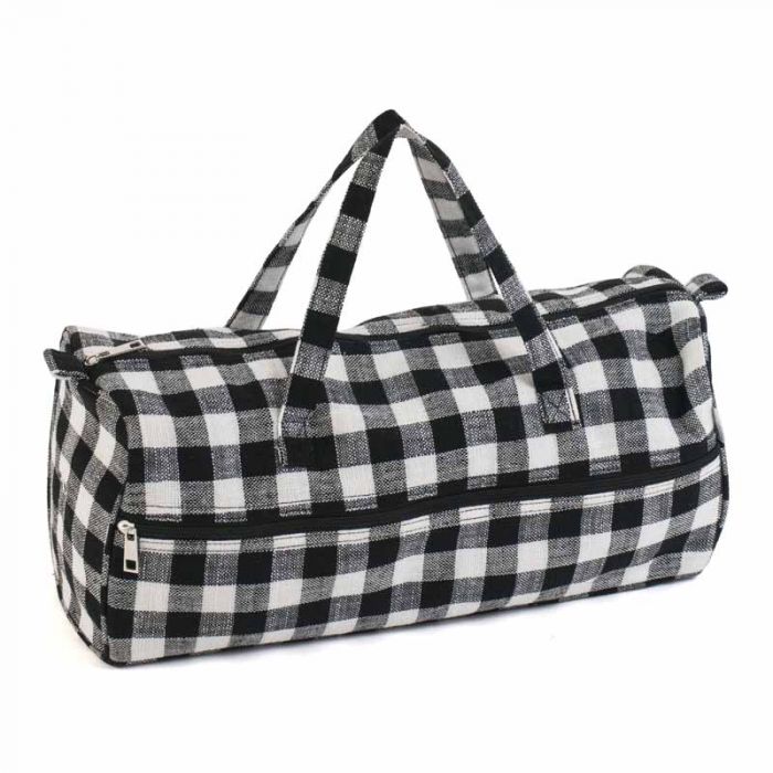 Knitting bag covered with matt PVC-coated cotton fabric in a Monochrome Gingham print. Zip up pocket on the front and with double handles. Eyelet for feeding through yarn. Perfect for storing knitting projects, yarn and pins up to 40cm long. Wipe clean. Item size: (d/w/h) 16.5 x 45 x 19.5cm.