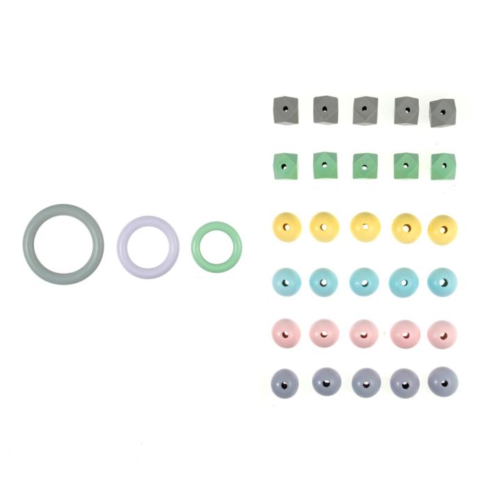 Mixture of pastel coloured wooden beads and wooden rings to use in a variety of macramé and craft projects.