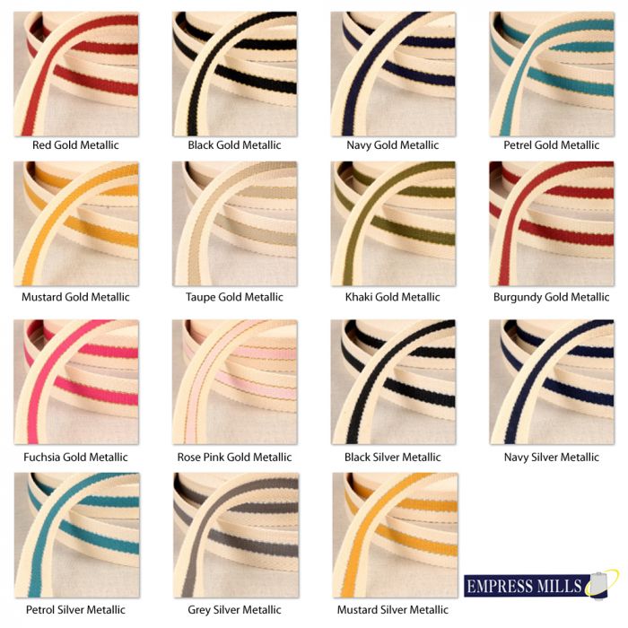 Luxurious cotton webbing with a touch of metallic to add that finishing touch. The webbing features a stripe design with the metallic element flanking the central stripe.