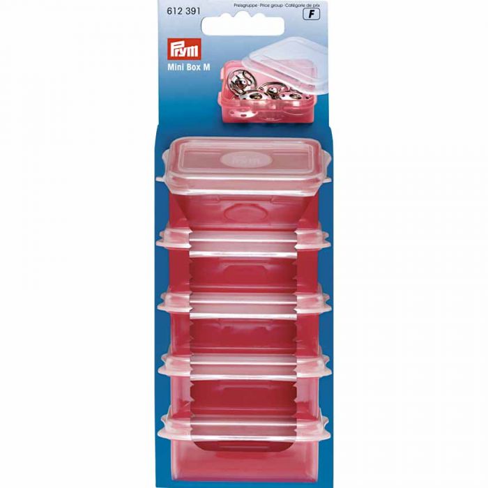 Stack of five mini plastic storage boxes ideal for storing your buttons, pearls, pins and beads etc. The base of the box is a red plastic with a clear plastic lid.