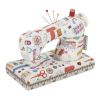 Made from 100% cotton fabric in a mini sewing notions print and features added extra details of thread bobbin, 'button' flywheel and more.