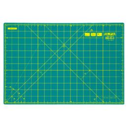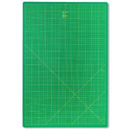 Foldable and easy to carry, the cutting mat's open format is 45 x 60 cm (A2), and folded it is 30 x 45 cm (A3). It can be used folded if working in more 'cosy' workshop conditions. The fold/spilt in the mat is cut in the shape of 'curvy teeth' which ensure an even surface when opened out.