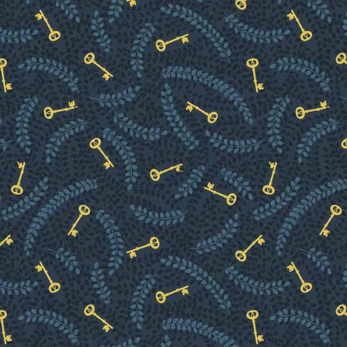 Secret Winter Garden Fabric | Leaves & Keys Dark Navy Metallic