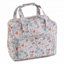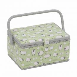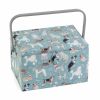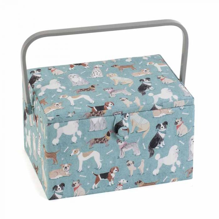 Large sewing box covered with 100% cotton fabric in a in a Dogs print. Plastic handle. Hard plastic internal tray with compartments for sewing accessories. Internal pocket and pincushion inside of lid. Spot clean only. Item size: (d/w/h) 23.5 x 31 x 20cm.