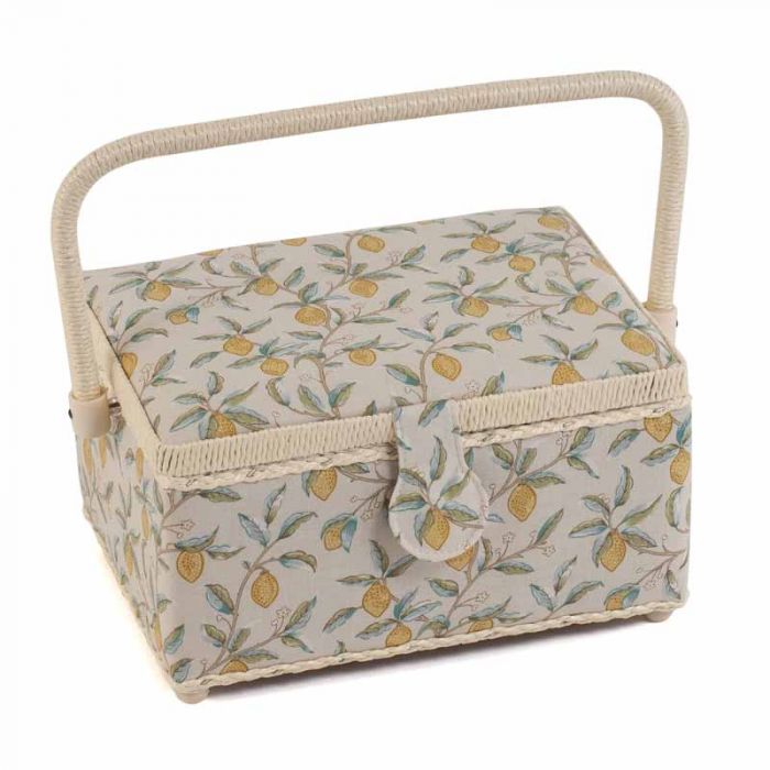 Medium-sized sewing box made from 100% cotton fabric in a Morris Lemons print. Lid with press stud fastening. Raffia handle and edging. Hard plastic internal tray with compartments for sewing accessories. Internal pocket and pincushion inside lid. Spot clean only. Item size: (d/w/h) 17.8 x 24.5 x 14.5cm.