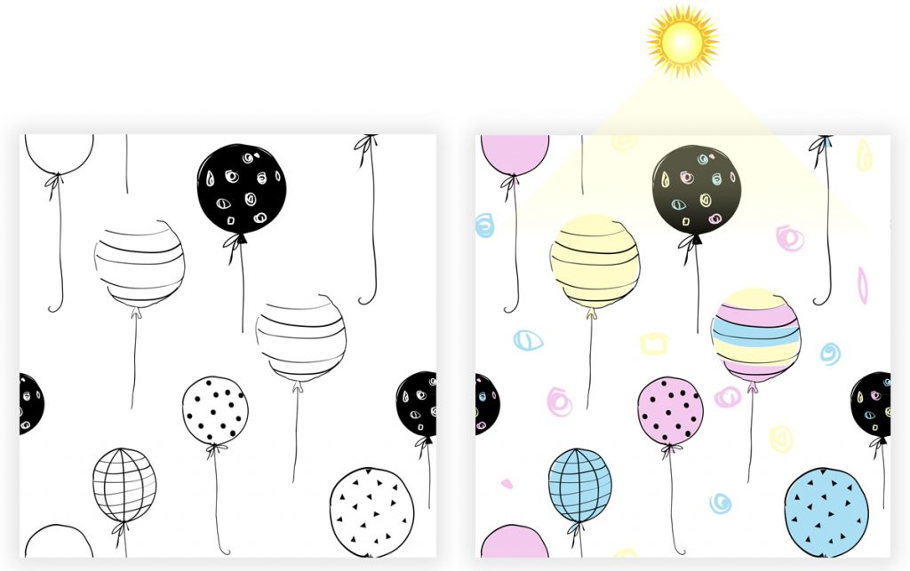 Displaying a design when in standard indoor light the pattern transforms literally before your eyes as the fabric is exposed to the uv rays in sunlight and a multitude of colours appear.