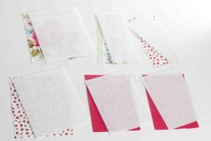 To make the bag, lay the fused outer fabric and lining material for the front out with the rights sides facing and sew them together along the top.