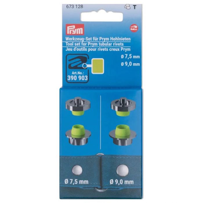 To do so Prym offers this tool set. It contains four riveting tools for tubular rivets with 7.5 and 9 mm in diameter as well as detailed step-by-step instructions. To ensure ease of use the tools are colour-coded and engraved with size info.