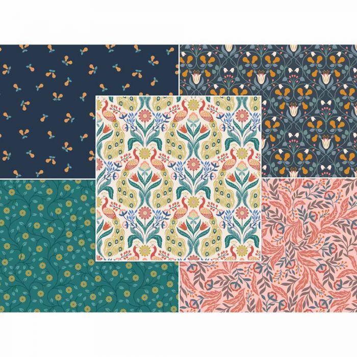 A beautiful arts & crafts inspired fabric collection featuring metallic elements for that finishing touch!