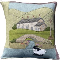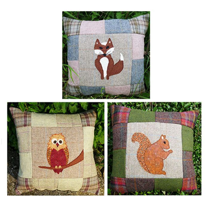 My own design using British wool tweed for the background and cotton for the applique. The woodland friends cushion pattern contains the applique designs for all three animals, the fox, the owl and the squirrel.